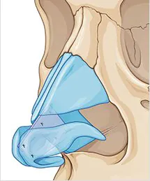 ②に関しては尾側鼻中隔延長(caudal septal extension graft)という方法になります。鼻中隔延長は「鼻尖と鼻柱の位置を決める手術」とも形容されるように、鼻先の構造を土台の部分から変える手術になります。内容としては、鼻先を形成する軟骨である「大鼻翼軟骨」を周囲から剥がし、新しい位置に持ってきます。この新しい位置に適切に配置するためには、鼻中隔を延長し、その延長物に大鼻翼軟骨を固定する必要があります。そのため、「鼻中隔延長術」と呼ばれているわけです。