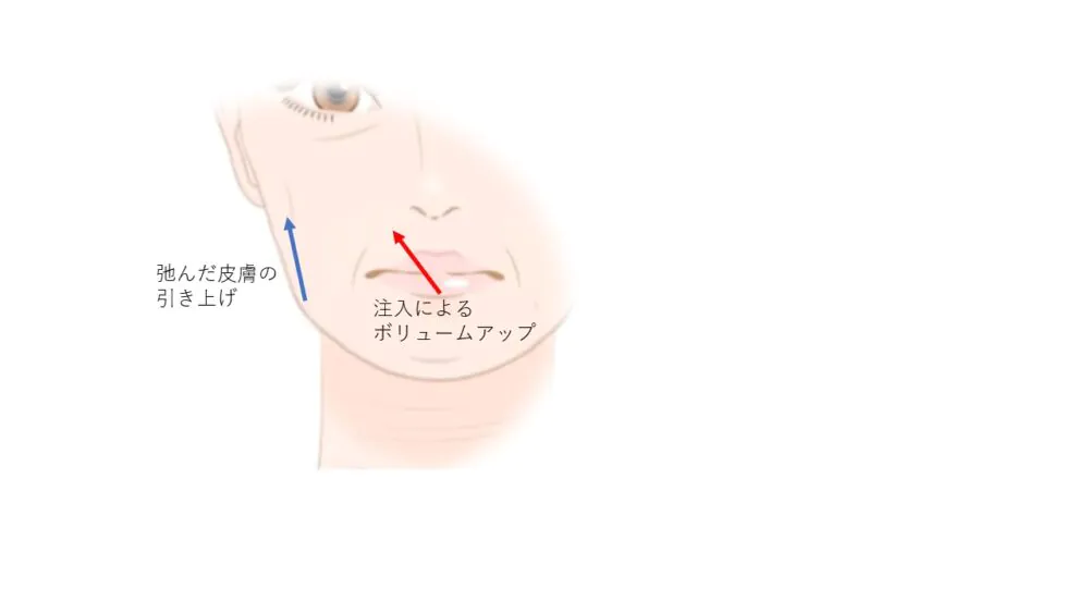 このような変化を見せる原因としては、コラーゲンなどの線維組織の減少・重力の影響によるジョールファットの弛みや、口角挙筋などの周囲の表情筋の弛緩などの影響が考えられています。