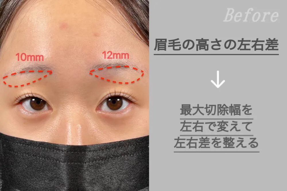 この患者様は、左右の眉毛の高さが異なっていたため、高い方(左)の切除幅を多めに設定しました。