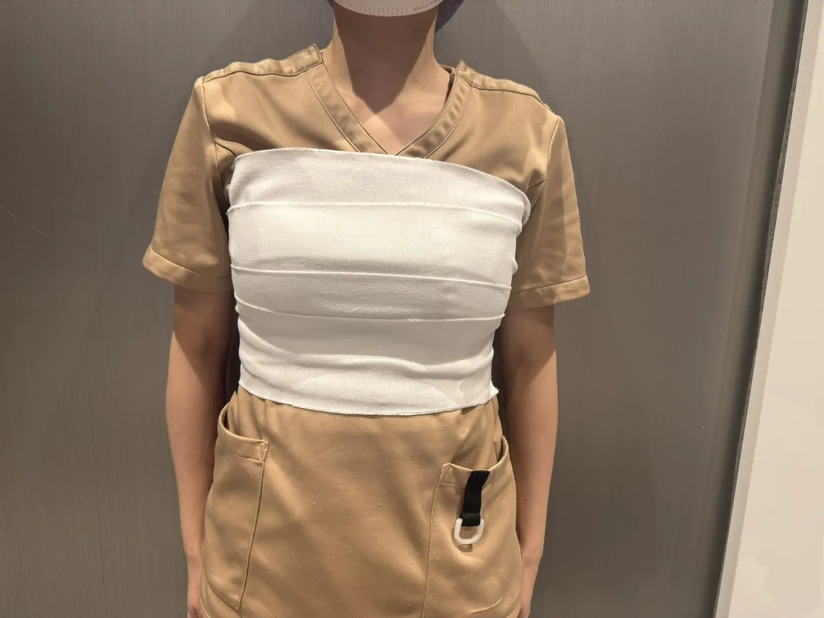 術後すぐにクリニックで装着させていただきますが、肌に直接バストバンドをつけるわけではなく、