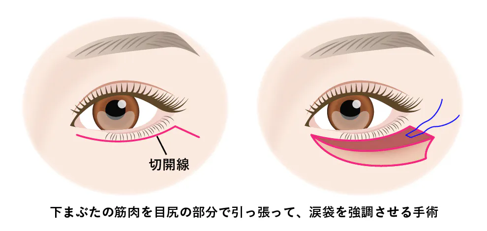タレ目形成術後に涙袋を残すためには大きく分けると2つの方法があります。