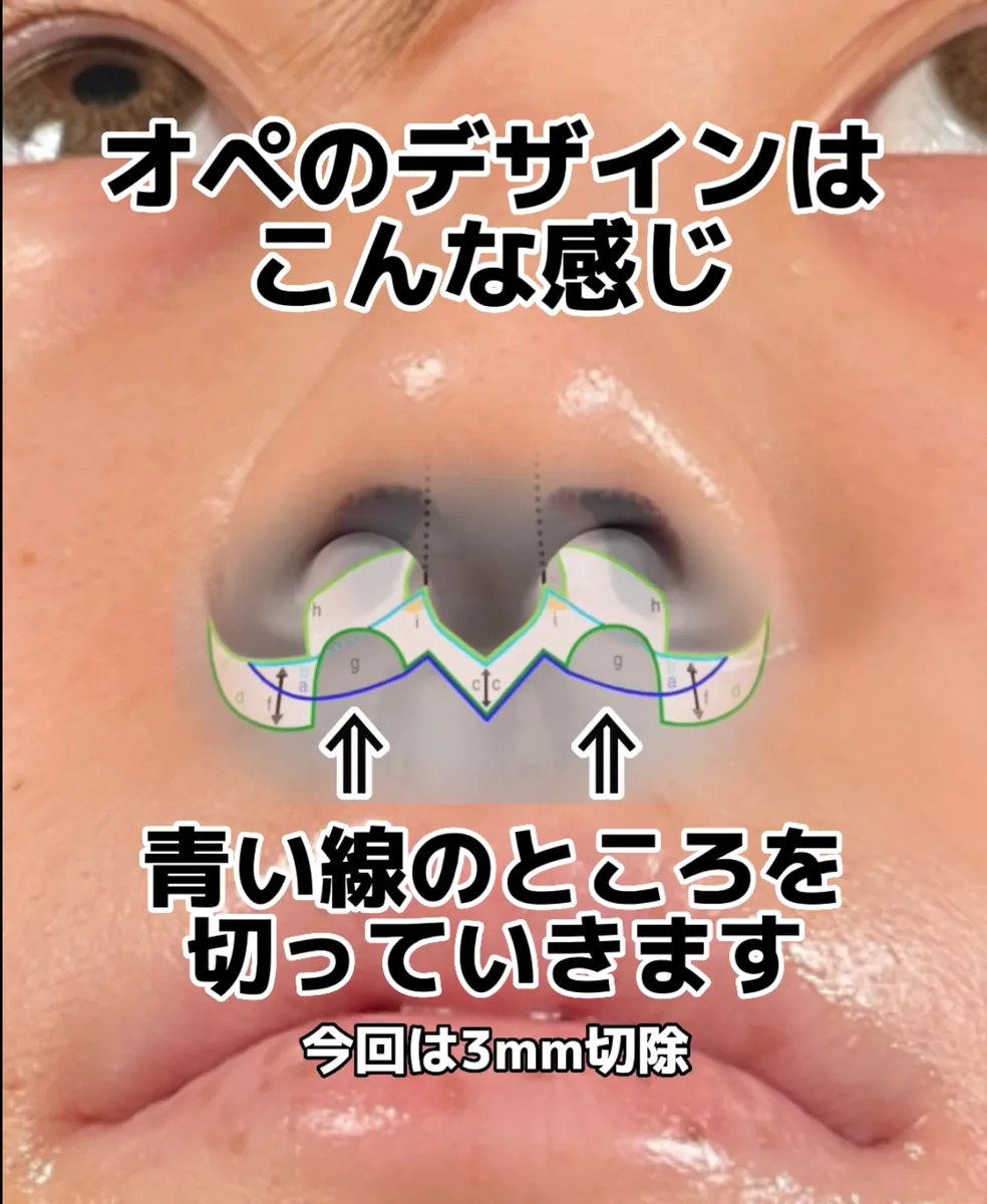 実際に切除する人中のデザインはこんな感じです。このデザインはsubnasal approachという方法で、鼻孔底隆起を温存することが出来ます。
