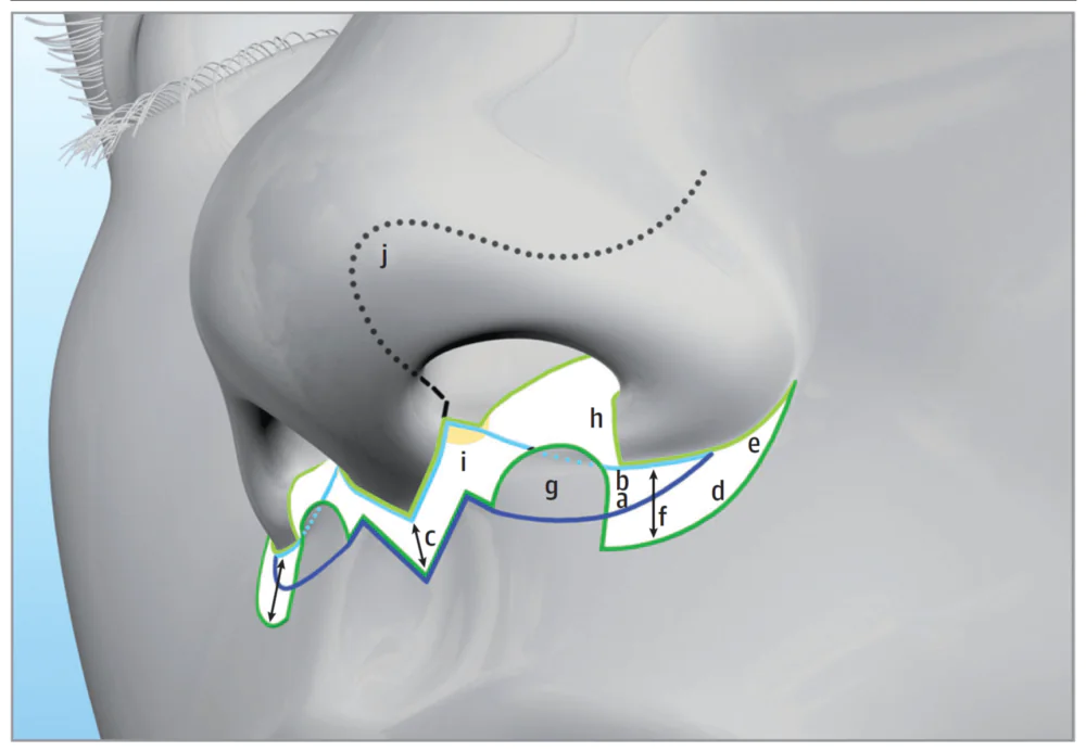 人中短縮とオープン法による鼻の整形の同時施術では通常の経鼻柱切開は行わず、人中短縮の傷を使い皮弁を挙上する。点線は鼻腔内の切開で、これを人中の傷と連絡させることで鼻の内部構造を露出することが出来ます。(JAMA Facial Plast Surg. 2018 Mar 1;20(2):166-167.)