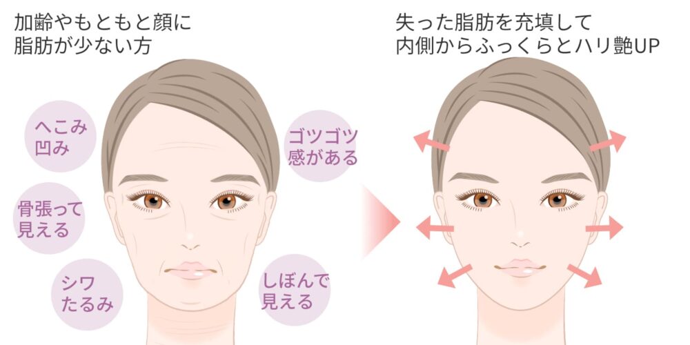 このような場合だと、輪郭を補充していく治療がメインとなります。こちらに関しては当院では「脂肪注入」や「ヒアルロン酸注入」でご対応も可能となっております。