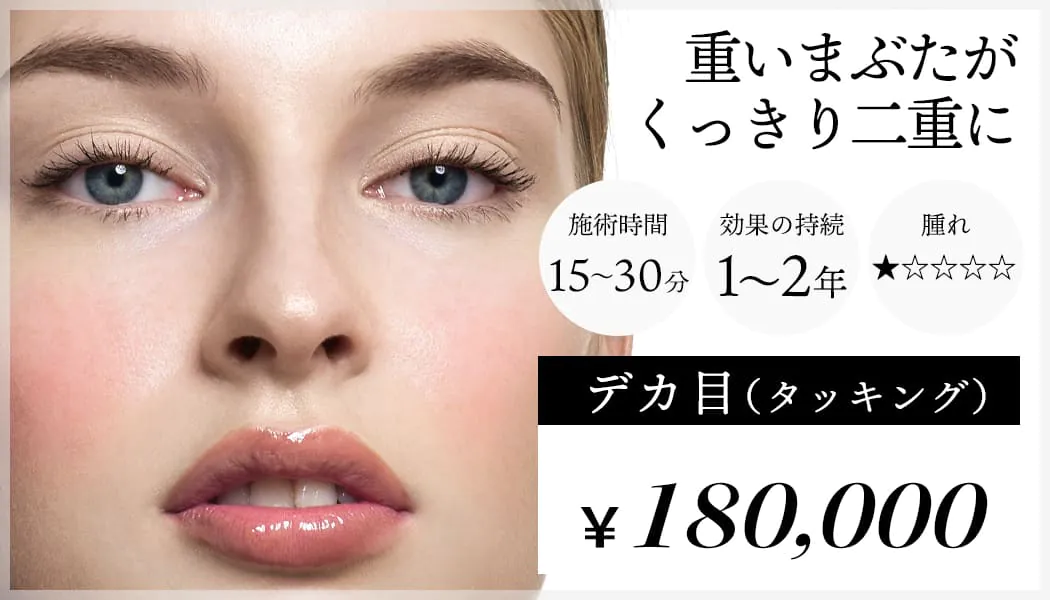 『デカ目(タッキング)』による二重整形です。※実際の診察では、おひとりお一人の皮膚や脂肪の厚みの状態に応じて、ご提案させていただく施術が異なる場合もございますのでご了承ください。