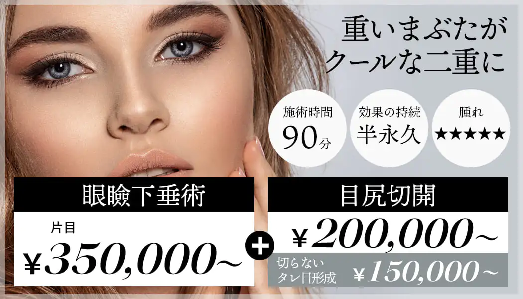 『二重切開法』+『タレ目形成』による組み合わせ二重整形です。※実際の診察では、おひとりお一人の皮膚や脂肪の厚みの状態に応じて、ご提案させていただく施術が異なる場合もございますのでご了承ください。