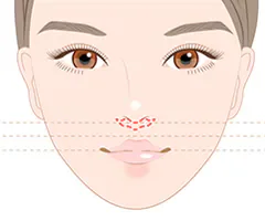人中と呼ばれる鼻と唇の間の部分の皮膚を一部切除し、鼻と唇の間の距離を短くする手術です。理想的な人中の長さは14~15mmほどと言われており、長めの人中は中顔面が広く見え、面長な印象になったり、やや老けて見えることがあります。人中短縮により、小顔効果や若返り効果があります。