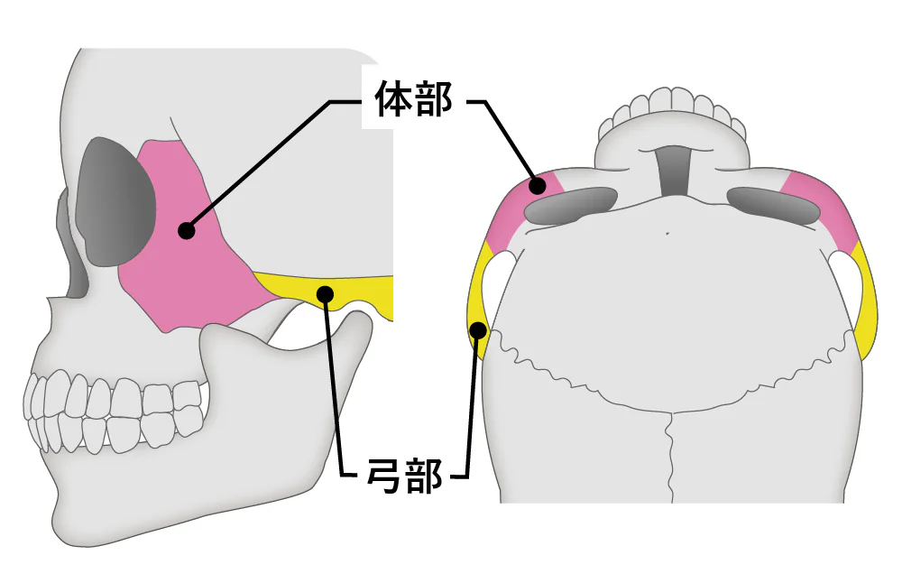 頬骨は体部(前面)と弓部(側面)で構成されており(※図参照)、どの部分が突出しているかによって、施術の内容は異なってきます。
