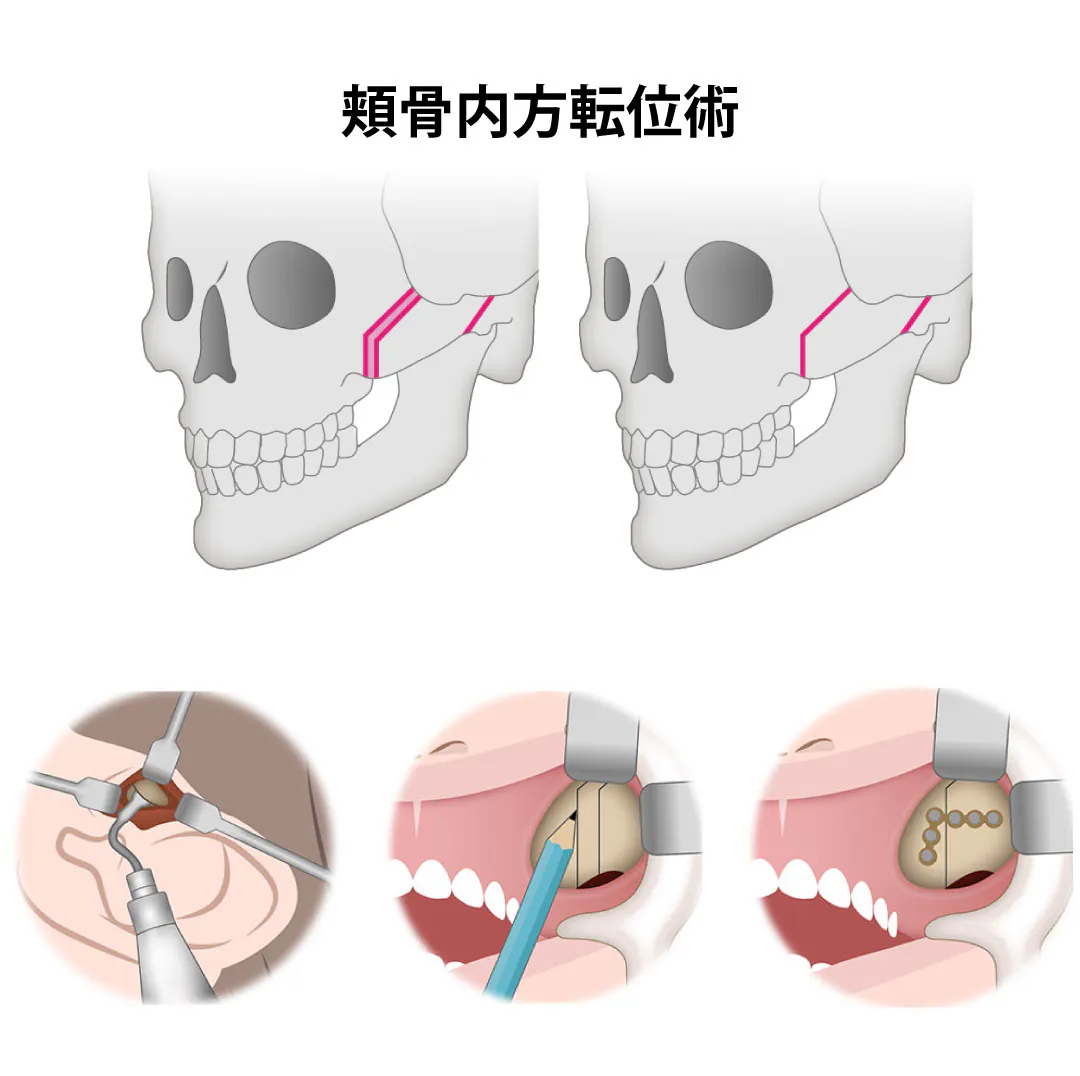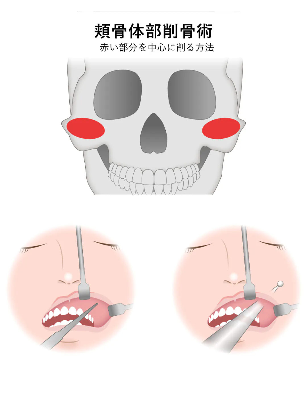 頬が前面に向かって張り出している場合に適応になります。全身麻酔下で手術をします。口腔内に傷を作り、頬骨体部と呼ばれる部分の骨の厚みを、表面から削り取っていき薄くしていく手術になります。上唇の裏側の粘膜を左右ともに2cm程度切開し(上口腔前庭切開)、上顎骨・頬骨体部を骨膜下の層で剥離し、露出します。頬骨体部の骨を削っていく手術になります。