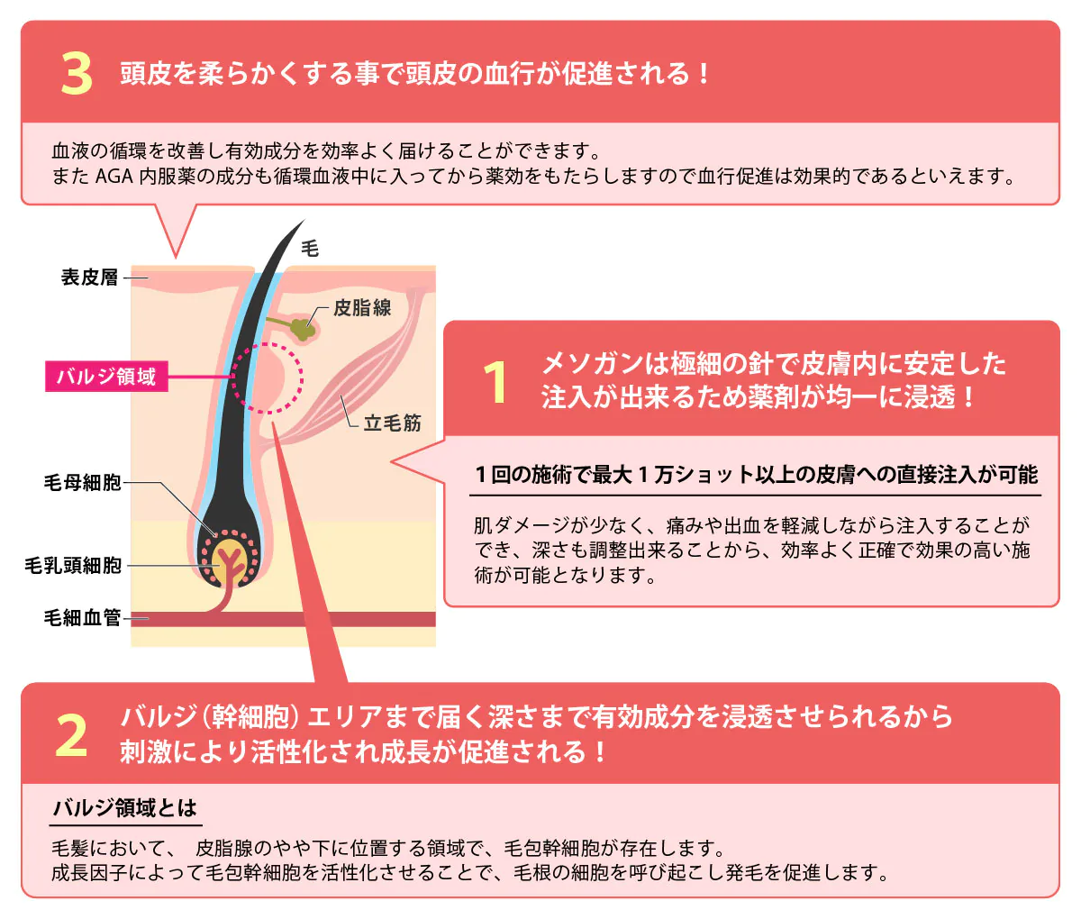 肌ダメージが少なく、痛みや出血を軽減しながら薬剤を均一に注入することができることから、幅広い目的で使用されますが、当院では発毛作用をもたらす薬剤を注入する治療として用いています。