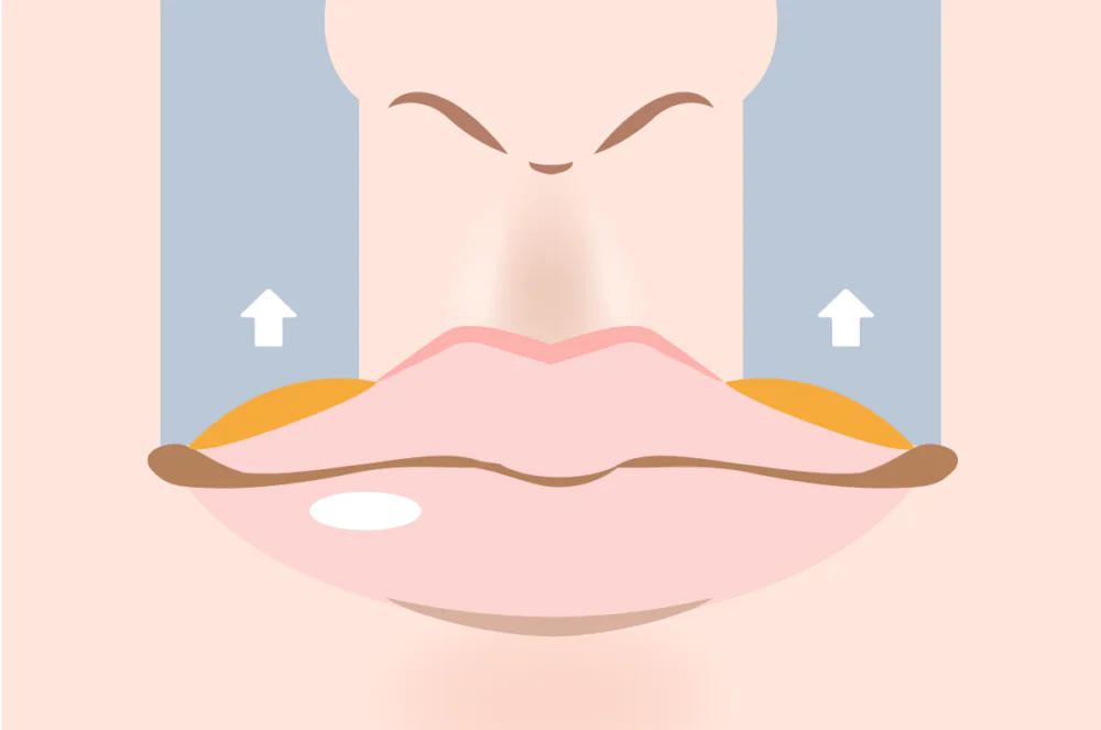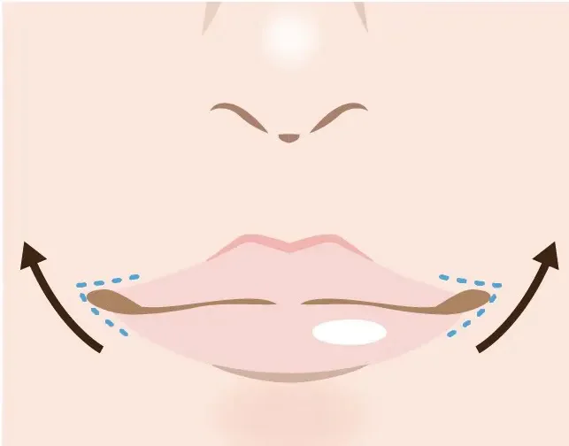 唇の中央だけでなく、左右(口角寄り)の部分も引き上げることで、全体的なバランスを調整します。