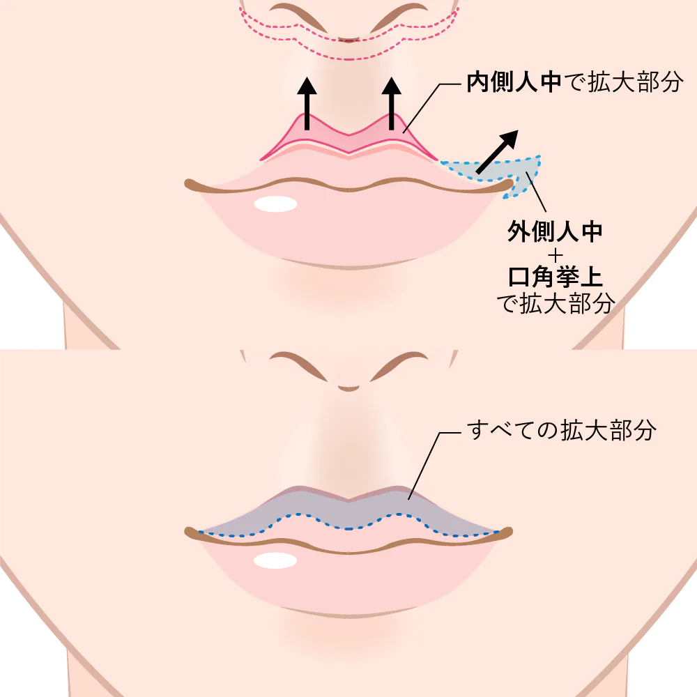 内側と外側の人中短縮術と口角挙上術を組わせた口唇拡大術。