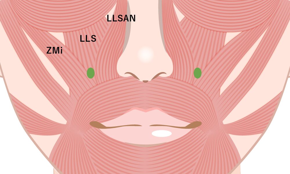 上唇を持ち上げる筋肉(上唇鼻翼挙筋)の働きを弱めることで、笑ったときの歯ぐきの露出を抑える方法です。