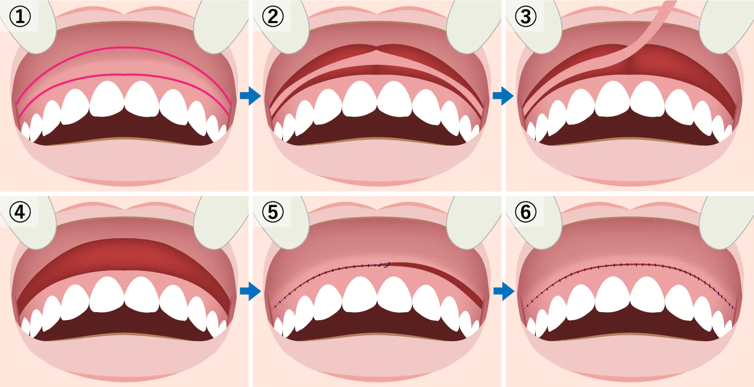 上唇の可動域を制限し、笑ったときに唇が過度に上がらないようにする手術です。