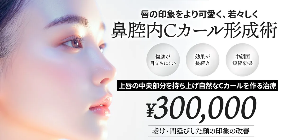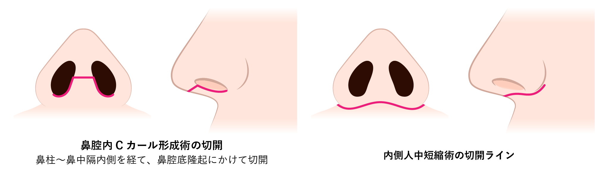 鼻の穴の内側と鼻柱から切開を行い、上唇の中央部分を持ち上げることで、自然な「Cカール」を作る施術です。