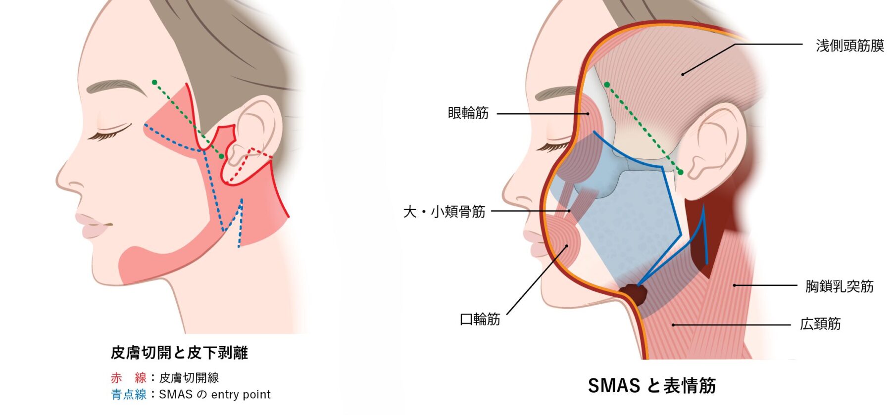 | アプローチ層 | SMASの上を剥離してSMASを剥離 | SMASの下を剥離し、皮膚とSMASを一体で移動 |