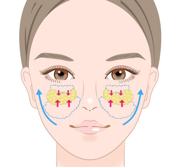 - 頬の下垂脂肪・口角周囲を上方・後方へ引き上げ