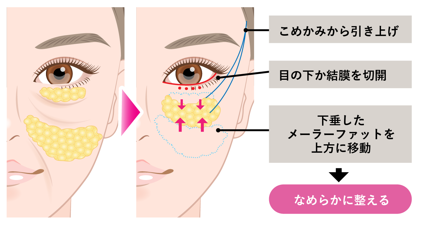 | 特徴 | 下まぶたの皮膚を開いて、眼輪筋・SOOF・頬脂肪を上方に固定。 目の下のたるみ改善に優れる。 |