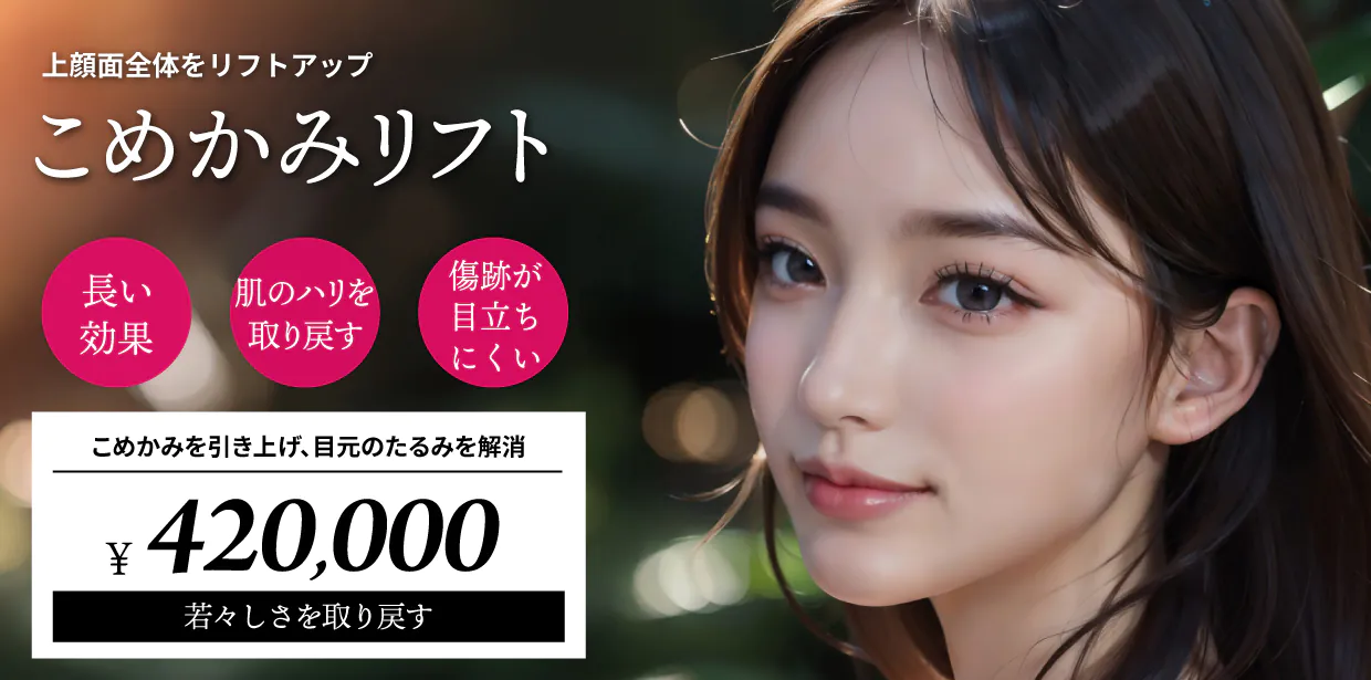 目尻や眉尻に近い部位の皮膚を切り取って筋膜をリフトアップするので、頭髪内で切開して行うこめかみリフトに比べ、目尻や眉尻を上げる効果は強くなります。