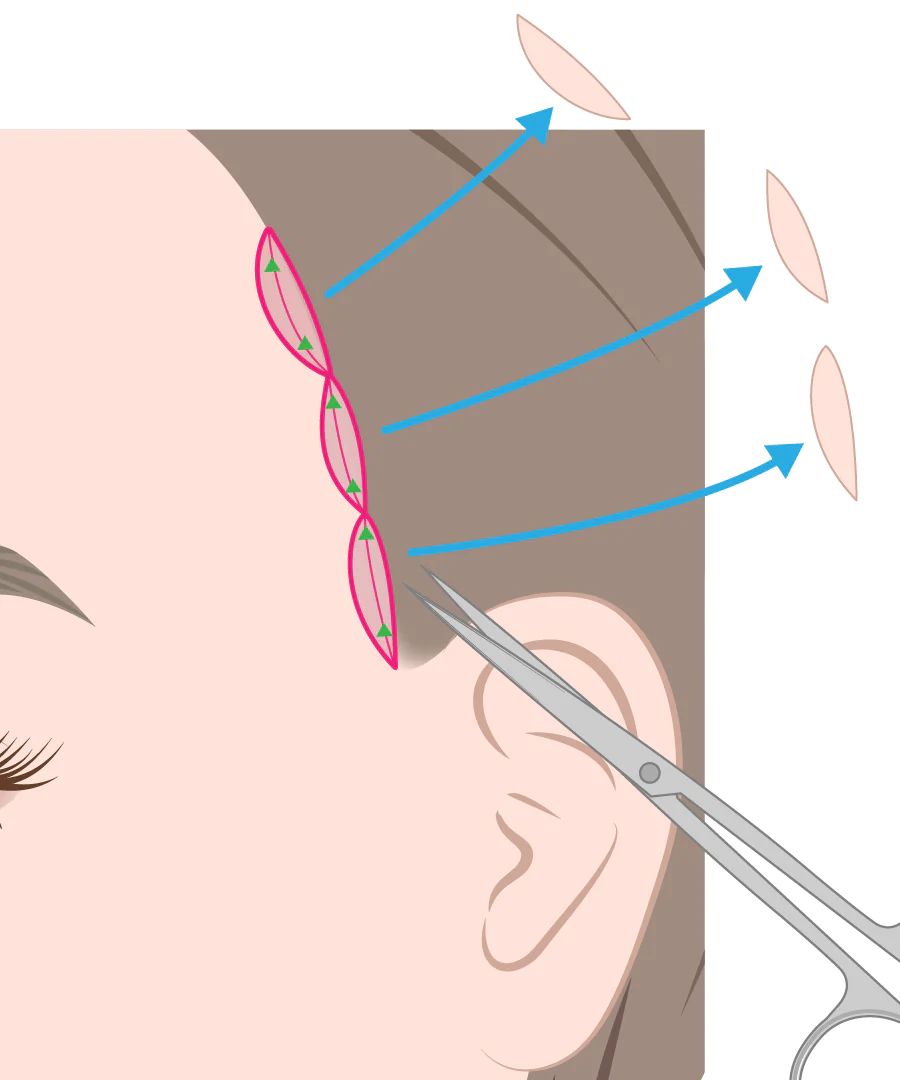 手術は、こめかみの生え際や頭髪に隠れる部分を切開して、こめかみと目もとのしわやたるみを引き上げて縫合します。