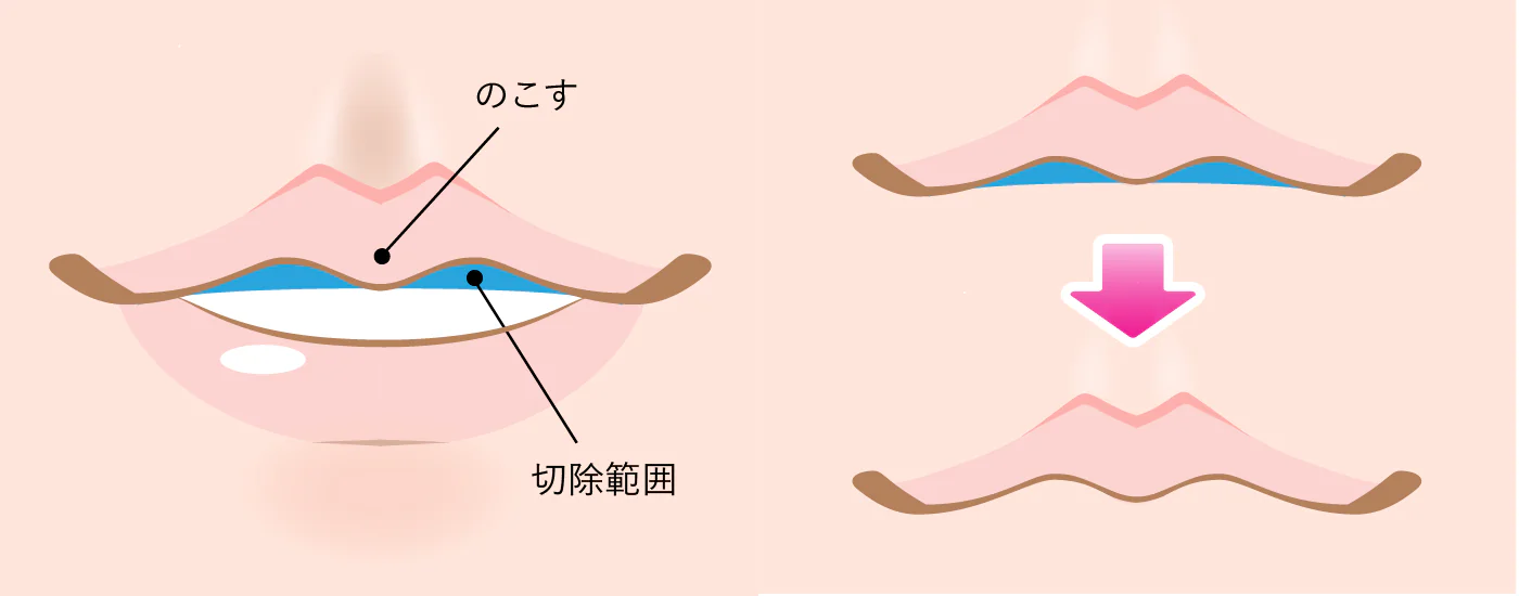 この手術では、上唇の中央から外側部分を一部切除し、縫合することで中央に膨らみを持たせ、左右に自然なカーブを強調することで、M字型の唇を作ります。
