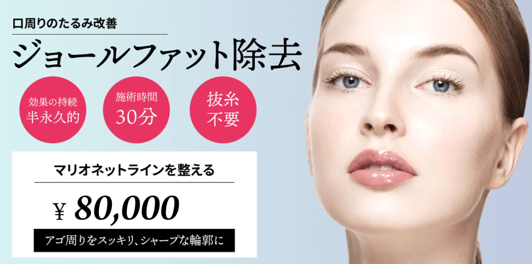 ジョールファットは口の横のもたつき部分の脂肪です。口横~口角下、マリオネットラインと呼ばれるシワの上の部分の脂肪です。