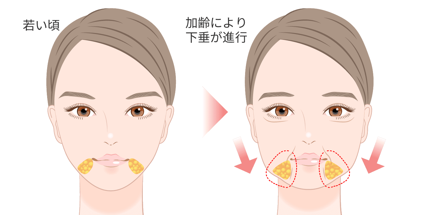 加齢以外にも遺伝的な要因も考えられますが、口角下のたるみやマリオネットラインが顕著になる、フェイスライン全体のゆるみなどが生じます。