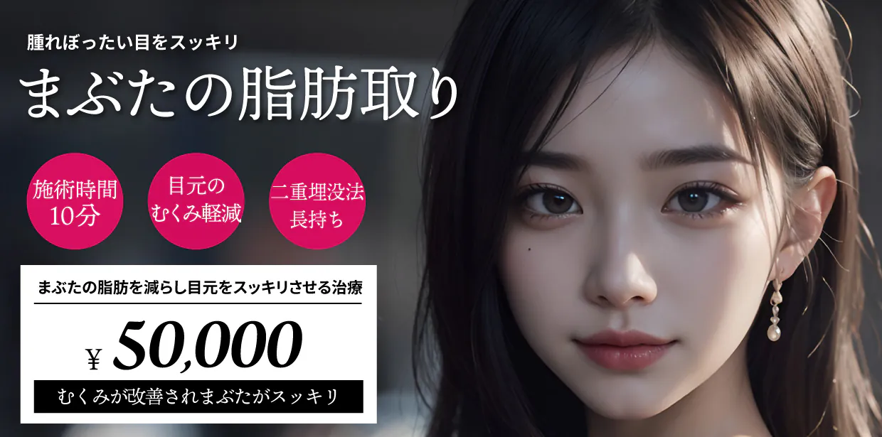 まぶたの余分な脂肪をわずか数ミリの切開で取り除く手術で、通常埋没法と同時に行います。埋没法二重術と組み合わせることでまぶたの腫れぼったさを改善し、二重のラインがくっきりします。