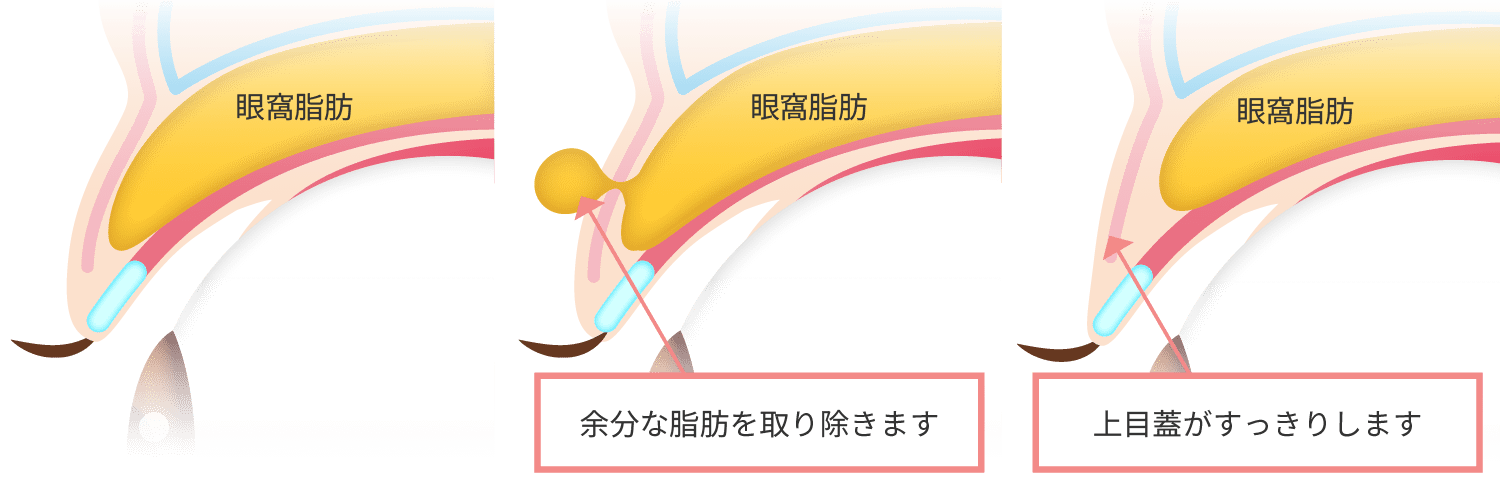 まぶたの余分な脂肪をわずか数ミリの切開で取り除く手術で、通常埋没法と同時に行います。埋没法二重術と組み合わせることでまぶたの腫れぼったさを改善し、二重のラインがくっきりします。