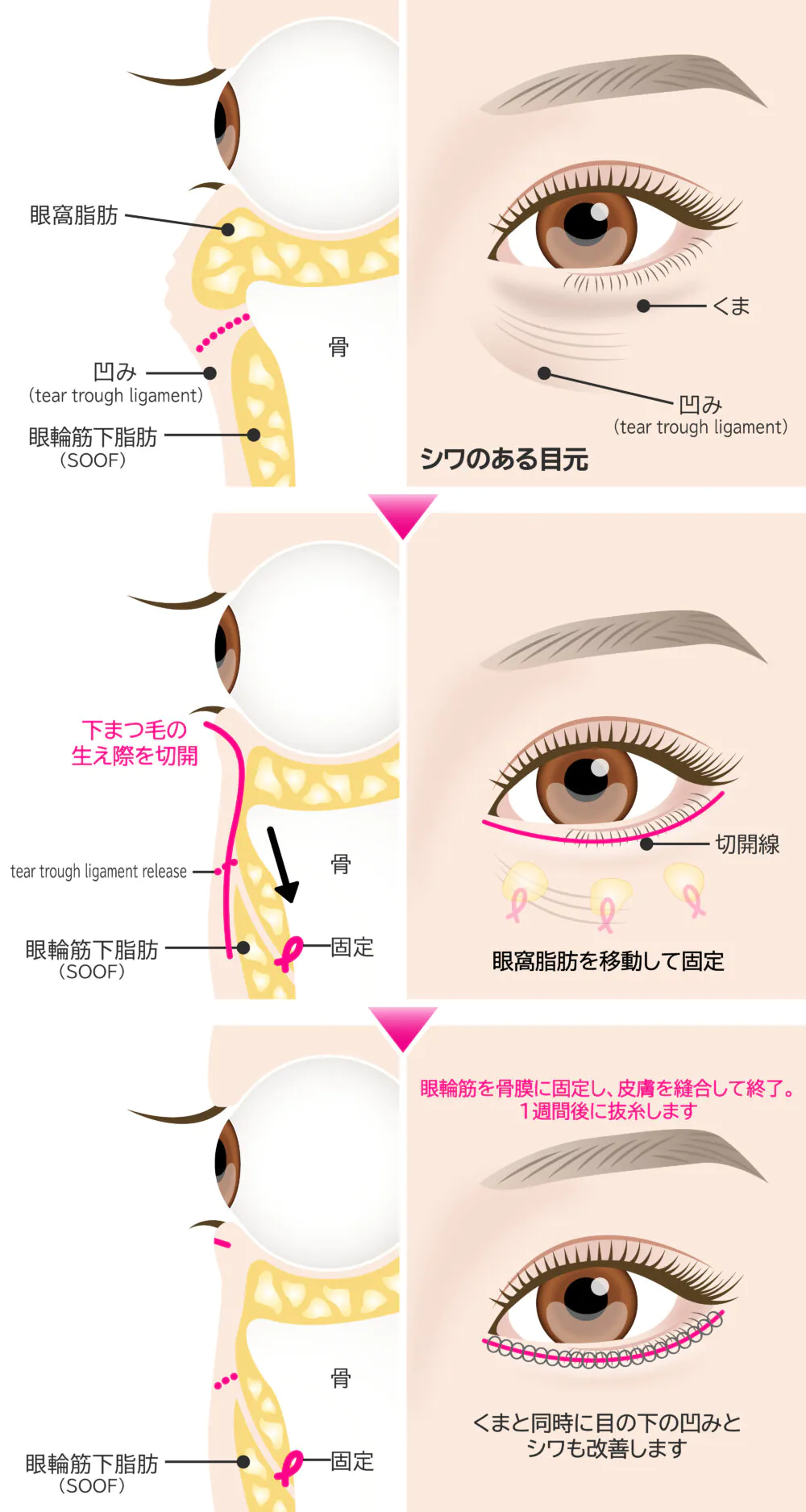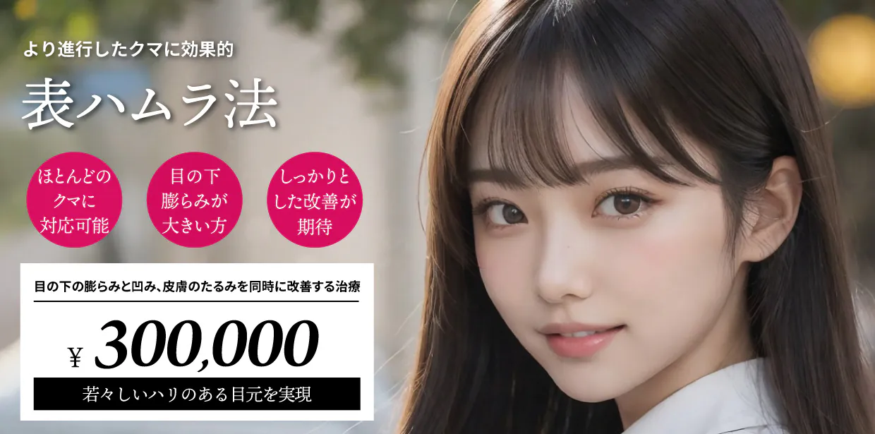 また、目の下のくぼみ(tear trough ligament という部分)が強い方は、ハムラ法でないとクマ治療の効果が不十分な場合もあります。表ハムラ法は皮膚や眼輪筋の緩みも同時に改善できるため、より進行したクマに効果的です。